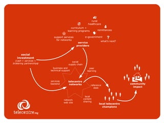 Telecentres are public places where people can access digital technologies like computers and the internet to learn skills, find information, and communicate. They exist in almost every country under different names. Telecentres aim to support community development by reducing isolation, bridging the digital divide, promoting health, and creating economic opportunities, especially for youth. There are over 100,000 telecentres globally but they need support like training, content, services, and financing to maximize their impact and sustainability.