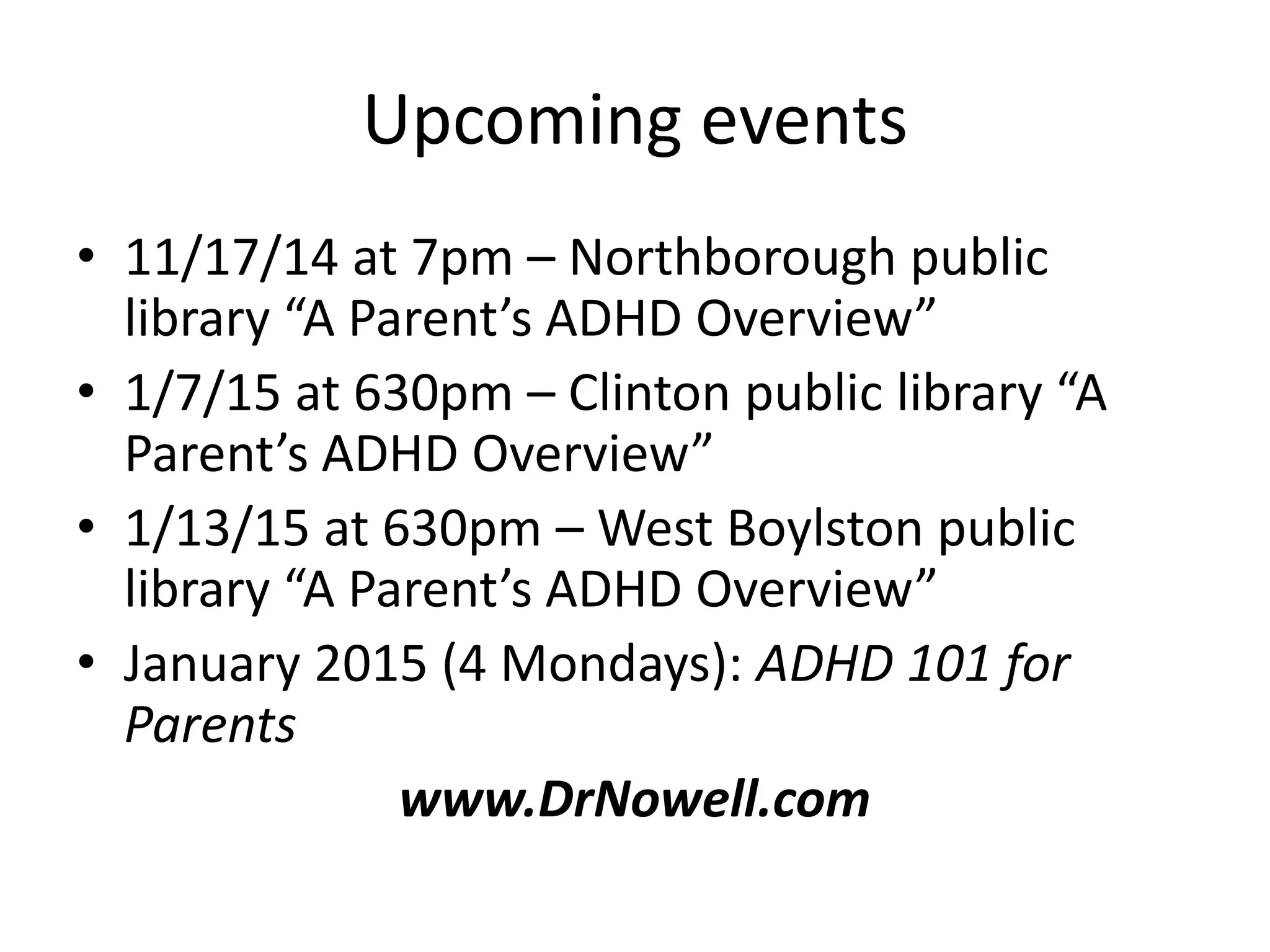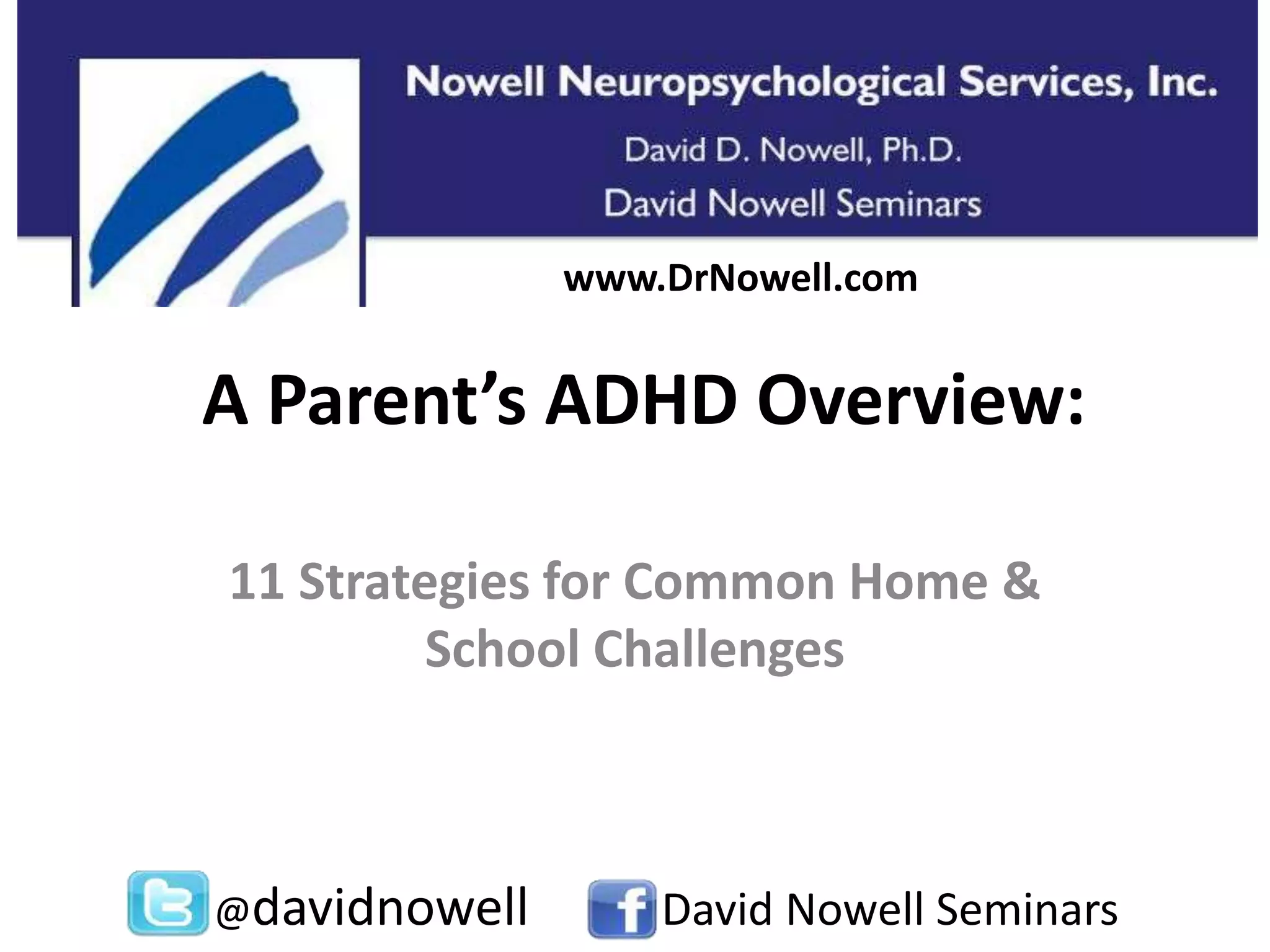 The document outlines strategies for parents dealing with ADHD challenges at home and school, featuring an overview of seminars conducted by David Nowell. Key strategies include managing nutrition, collaborating with a support team, utilizing effective study techniques, and exploring medication options. The document also invites parents to join an e-newsletter for ongoing support and information.