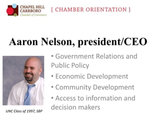 The Chapel Hill-Carrboro Chamber of Commerce aims to serve and advance local businesses. It has over 1,300 members across the region and advocates on behalf of business interests. The Chamber connects members to resources, saves them money through deals and discounts, and helps develop leaders in the community. It also works to attract talent and investment through various initiatives.