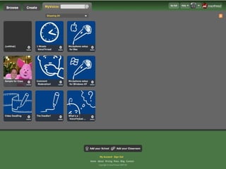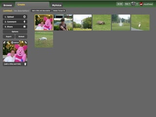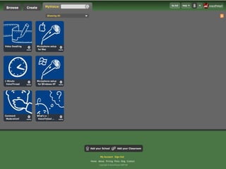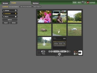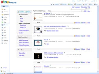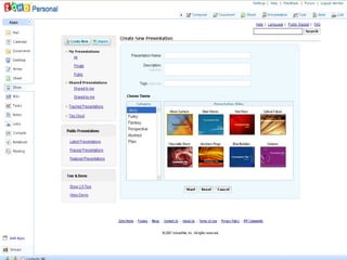 This document provides a summary of various presentation tools including PowerPoint, Google Docs, Zoho, VoiceThread, and OpenOffice. It also lists additional presentation tools such as Photo Story, Preezo, BrinkPad, Scooch, PrezentIt, Empressr, ProfCast, SlideRocket, Zentation, Toufee, TelePark Wiki, TalkingLetters, Delicious Presenter, Amazon Slideshow Widget, StoryMaker, FlowGram, ShowBeyond, and links to pages about using and sharing presentations.