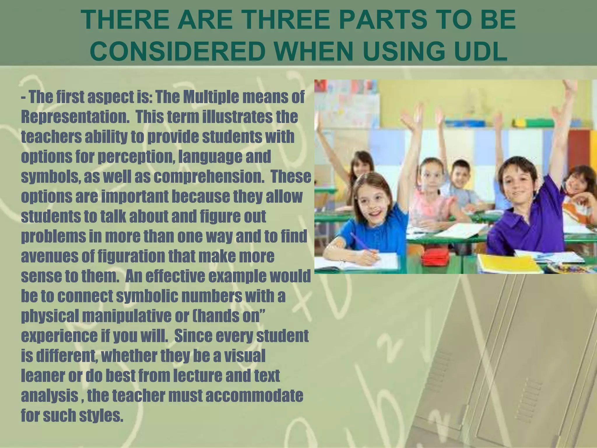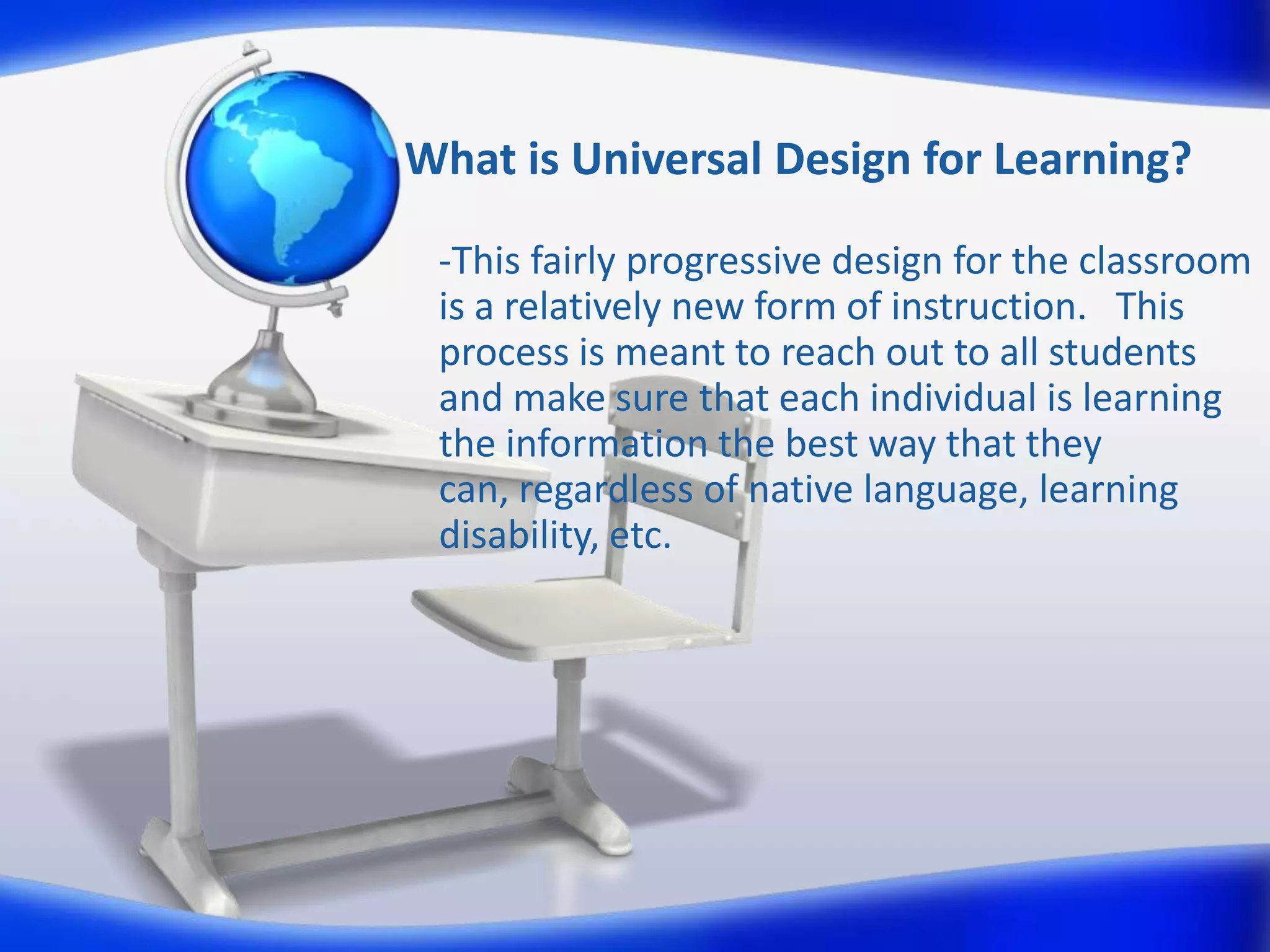 Universal Design for Learning (UDL) is an instructional framework that provides multiple means of representation, expression, and engagement to accommodate different learning styles and abilities. It encourages teachers to present content in various formats, allow different modes of student response, and employ motivational techniques to engage all students. UDL has three main parts: providing multiple means of representation through diverse content delivery options, multiple means of expression so students can demonstrate understanding in their preferred way, and multiple means of engagement to sustain student interest and drive learning. When using UDL, teachers should consider goals, materials, instructional methods, and assessment tools to effectively reach every student.