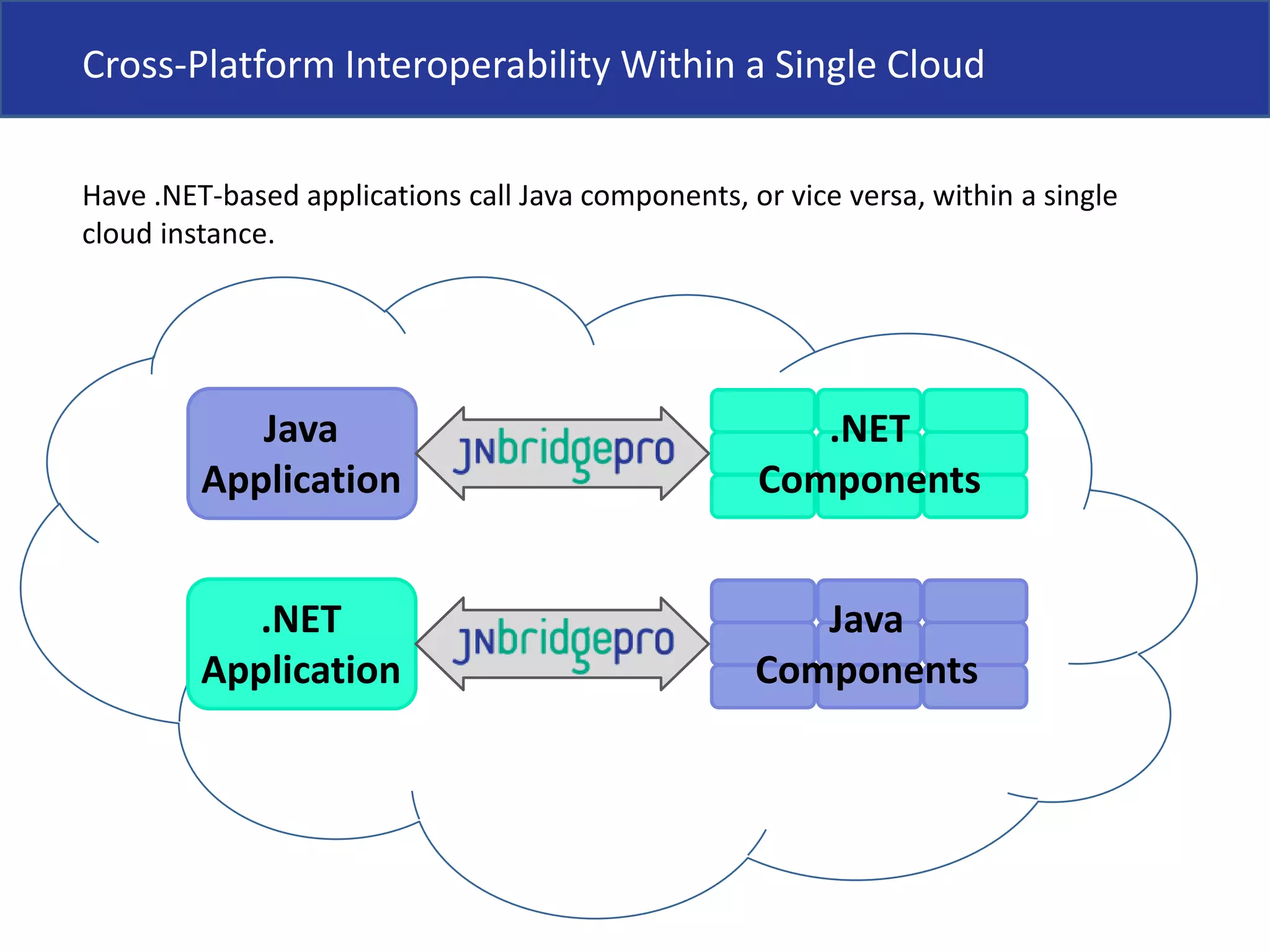 This document discusses using JNBridgePro to enable cross-platform interoperability between Java and .NET applications within a single cloud. It provides examples of using JNBridgePro to allow .NET applications to access Java components and APIs, and vice versa, including accessing REST APIs, web services, and migrating applications between platforms like EC2 and Azure.
