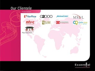 The document provides information about Essential Werkz Pte Ltd, an event planning company. It discusses their services such as event management, branding, marketing strategies and below the line activities. It also includes case studies and discussions on key aspects of event planning like creating an event brief, proposal, timeline and dividing tasks. The document offers guidance and examples on effectively planning and executing events.