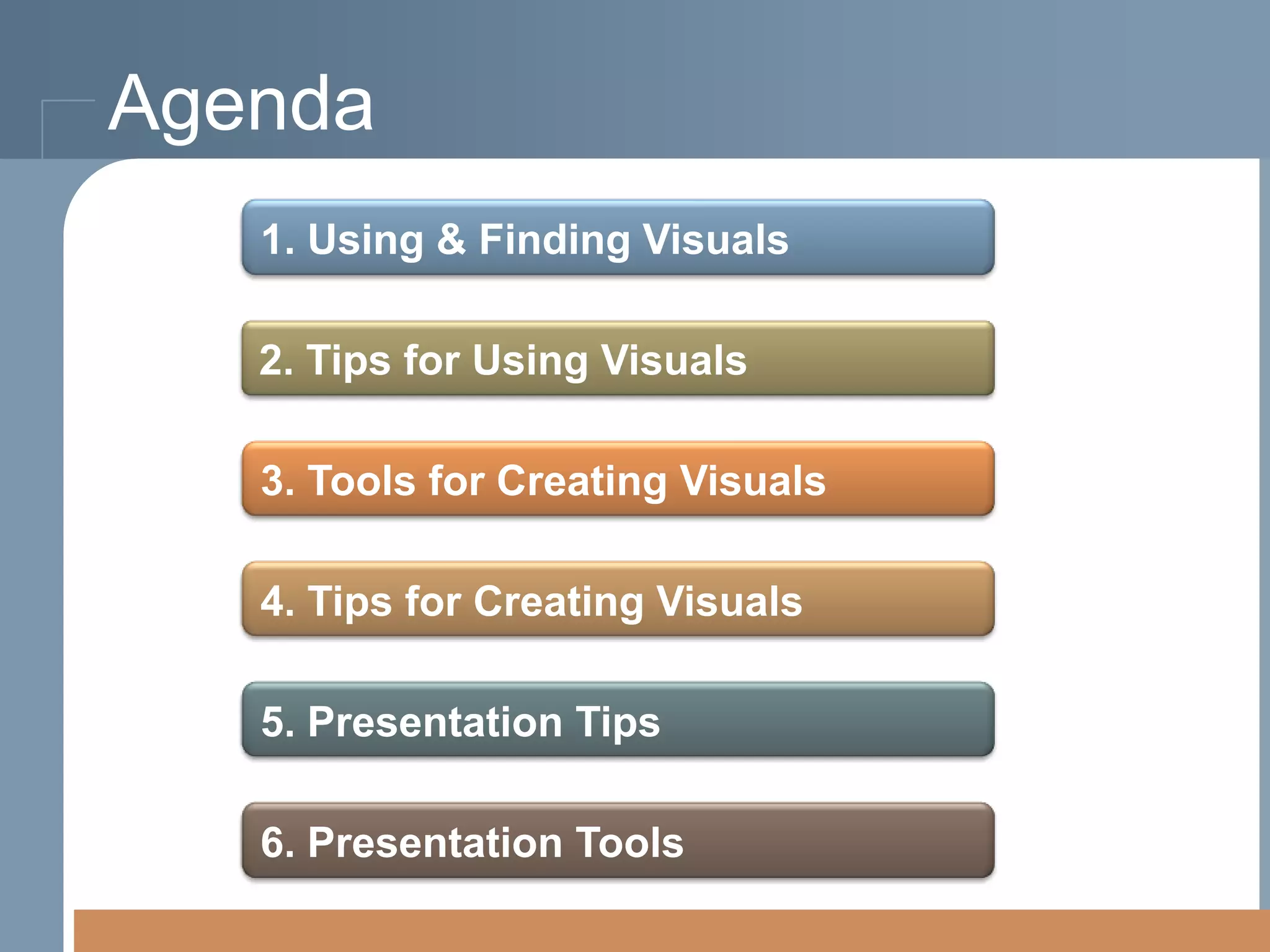 This document provides tips and tools for creating and using visuals effectively in presentations. It discusses finding and using existing visuals such as photos, graphics and videos. It also provides tips for creating visuals using tools like online chart builders and photo editors. Guidelines are given for designing visuals with considerations for layout, color, font and keeping the visuals simple and clear. The document also discusses using visuals appropriately for different audiences and topics. Overall presentation tips are provided such as including an agenda, title slide and contact information.