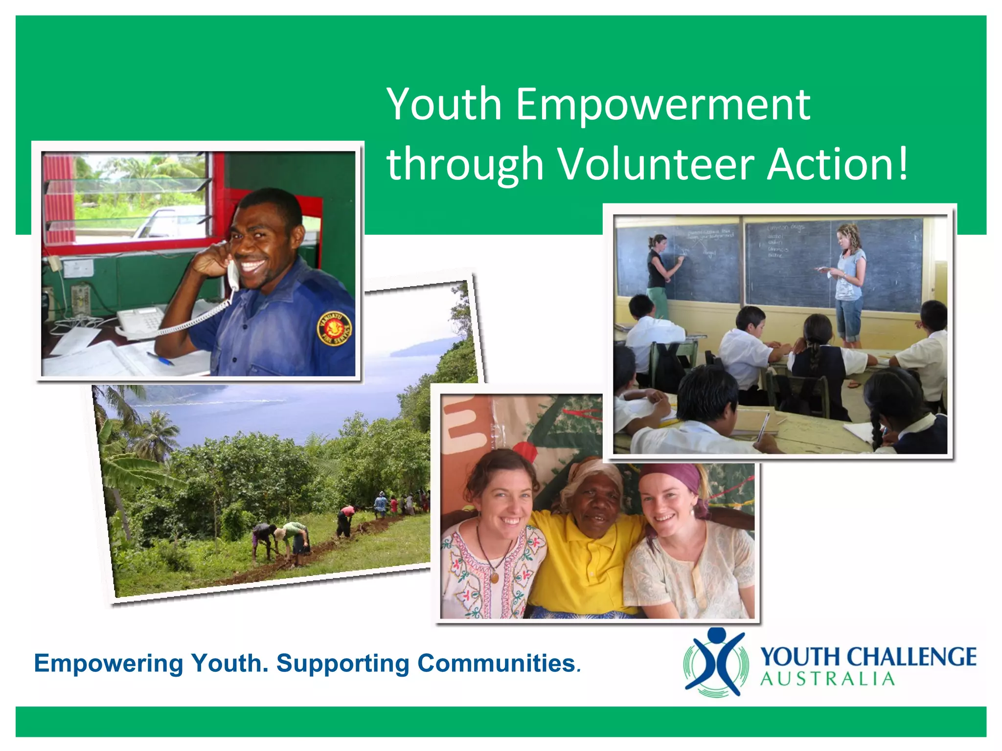 Youth Challenge Australia (YCA) is a nonprofit organization that engages Australian volunteers in grassroots development work in Central Australia, Vanuatu, India, Costa Rica, Guatemala, Mexico and Guyana. YCA aims to improve access to education, infrastructure, healthcare, and cross-cultural understanding through small team projects identified by local communities. Since 1996, over 2500 Australian youth volunteers have built schools, water systems, delivered health education, and implemented environmental and women's empowerment programs through YCA.