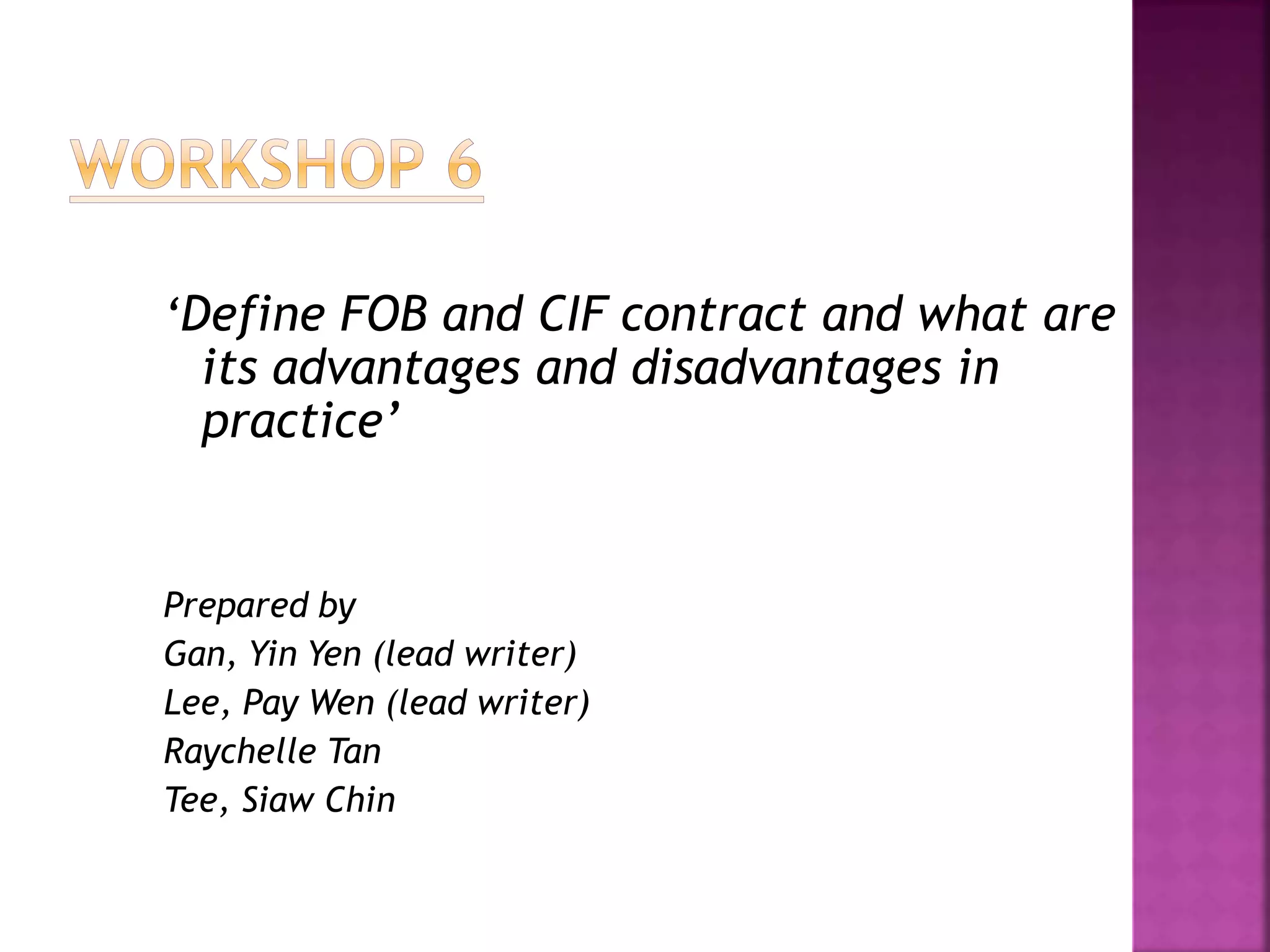 FOB (Free on Board) is a contract where the seller fulfills their obligations by loading the goods onto a ship. Under an FOB contract, risk and responsibility transfer from seller to buyer when the goods pass over the ship's rail. There are three variations of an FOB contract depending on who arranges shipping. CIF (Cost, Insurance, Freight) is similar but also includes insurance and freight costs paid by the seller. FOB contracts are lower cost for buyers but impose more duties, while CIF provides more security but at a higher price. Both contracts have advantages and disadvantages that parties must consider.