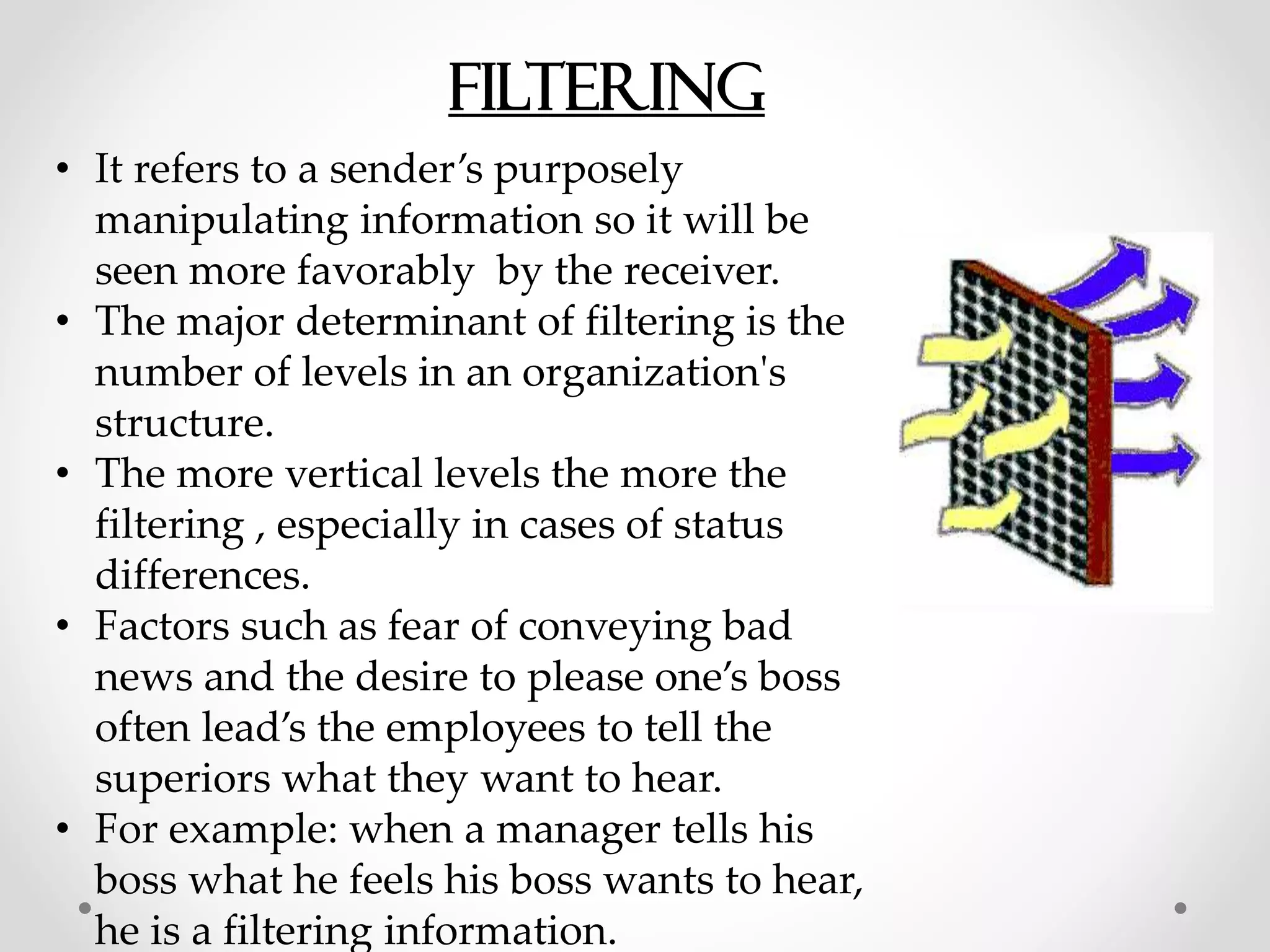 The document discusses several barriers to effective communication, including filtering of information, selective perception, information overload, emotions, language differences, communication apprehension, gender differences, and lack of interest. Filtering refers to manipulating information to be seen favorably by the receiver and is influenced by organizational structure. Selective perception involves personal filtering of what we see and hear to suit our own needs. Information overload occurs when receivers are unable to handle large amounts of data. Emotions and language differences can also impact how messages are interpreted. Communication apprehension causes anxiety in oral or written interactions. Gender differences influence communication styles and reasons for communicating. Lack of interest from senders or receivers can break down communication.
