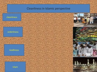 Cleanliness is important in Islam, with ablution (washing parts of the body like the face and arms with water) before prayers and full washing (ghusl) required after activities like sleep. Proper cleanliness and orderliness reflects inner Godliness according to Islamic teachings.