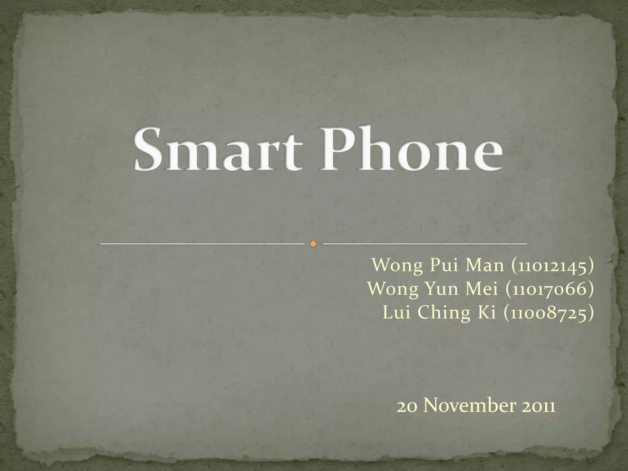This document provides background information and survey results regarding smartphones. It begins with definitions and a brief history of smartphones. It then outlines the objectives and methodology of a survey conducted on smartphone usage. The results of the survey show that most users are younger individuals who own popular brands like Apple and Samsung. The majority find smartphones useful and plan to continue using them. Common concerns include price and need for improved battery life and durability. In the future, smartphones are predicted to become more widespread and integrated into daily life.