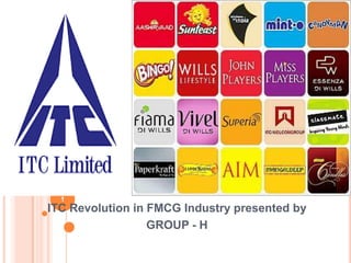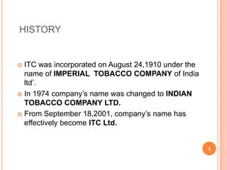 ITC began as a tobacco company in 1910 but has since diversified into various industries including foods, hotels, paper, and personal care products. It aims to reduce dependence on cigarettes through international quality products and strong brand portfolios. ITC analyzes its strengths, weaknesses, opportunities, and threats and launches new FMCG initiatives. These include branded packaged foods, lifestyle retailing, personal care products, education and stationery, safety matches, and incense sticks. ITC's success is attributed to segmentation, leveraging group synergies, tailored communication strategies, selective brand extensions, strategic brand ambassadors, and distinctive packaging.