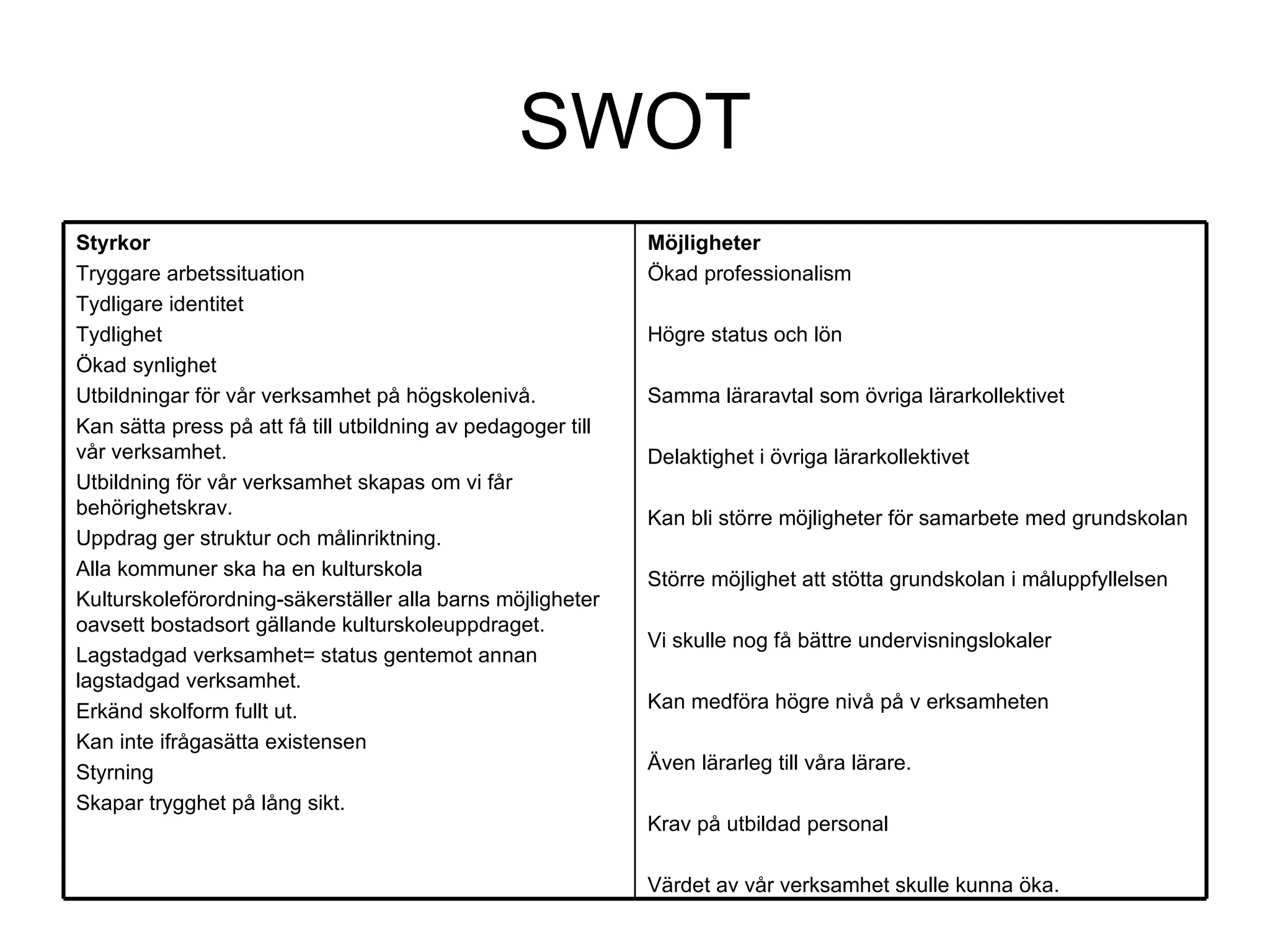 SWOT Möjligheter Ökadprofessionalism Högre status och lön Samma läraravtal som övriga lärarkollektivet Delaktighet i övriga lärarkollektivet Kan bli större möjligheter för samarbete med grundskolan Större möjlighet att stötta grundskolan i måluppfyllelsen Vi skulle nog få bättre undervisningslokaler Kan medföra högre nivå på v erksamheten Även lärarleg till våra lärare. Krav på utbildad personal Värdet av vår verksamhet skulle kunna öka. Styrkor Tryggare arbetssituation Tydligare identitet Tydlighet Ökad synlighet Utbildningar för vår verksamhet på högskolenivå. Kan sätta press på att få till utbildning av pedagoger till vår verksamhet. Utbildning för vår verksamhet skapas om vi får behörighetskrav. Uppdrag ger struktur och målinriktning. Alla kommuner ska ha en kulturskola Kulturskoleförordning-säkerställer alla barns möjligheter oavsett bostadsort gällande kulturskoleuppdraget. Lagstadgad verksamhet= status gentemot annan lagstadgad verksamhet. Erkänd skolform fullt ut. Kan inte ifrågasätta existensen Styrning Skapar trygghet på lång sikt.