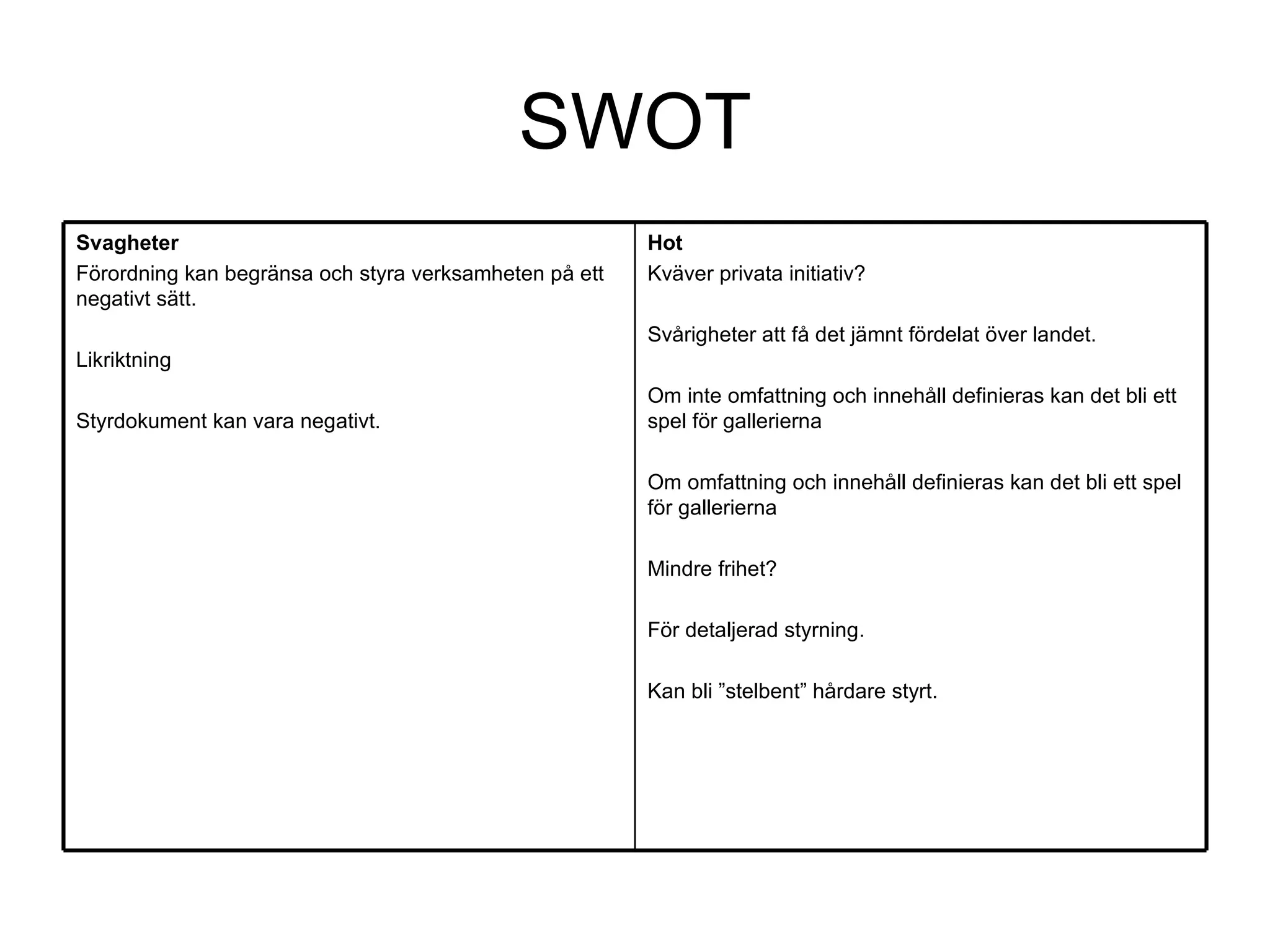 SWOT Hot Kväverprivata initiativ? Svårigheter att få det jämnt fördelat över landet. Om inte omfattning och innehåll definieras kan det bli ett spel för gallerierna Om omfattning och innehåll definieras kan det bli ett spel för gallerierna Mindre frihet? För detaljerad styrning. Kan bli ”stelbent” hårdare styrt. Svagheter Förordning kan begränsa och styra verksamheten på ett negativt sätt. Likriktning Styrdokument kan vara negativt.