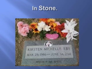 This document contains poems, quotes, and messages mourning the death of someone named Kirsten. It expresses sadness at her passing, memories of the time they shared together, and difficulty coming to terms with her being gone. The overall theme is grieving the loss of a loved one named Kirsten.