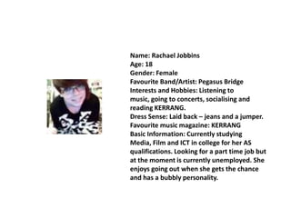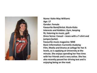 The document contains profiles of 4 females between ages 17-18, including their name, age, gender, favorite band/artist, interests and hobbies, dress sense, favorite music magazine, and basic information. Rachael Jobbins is 18 and studies media while unemployed, Katie May Williams is 17 and studies film/media/drama while active in her free time, Faye Roche is 17 and studies health/social while unemployed and looking for work, and Joely Cox is 18 finishing A-levels while working part time and spending free time with her girlfriend.