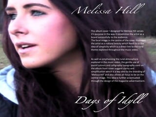 The document summarizes the design of an album cover and related materials for the artist Melissa Hill. The album cover features a central image of the artist set against a backdrop suggesting rural natural beauty, simplicity, and clarity. This theme of rural natural beauty and simplicity is continued across the inside cover, back cover, and a magazine advertisement. The inside cover and back cover feature stills from a music video set in the countryside. Overall, the design establishes Melissa Hill's brand and promotes her themes of rural natural beauty and simplicity across different materials.