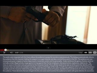 The document provides analysis of scenes from the film "Safe House". It summarizes that the opening shot establishes the modern urban setting and issues covered in the film. A close-up scene shows the main character holding a gun, identifying him as a rogue agent, and building intrigue around his character. A later scene shows the character strapped to a chair but calm, reinforcing his danger and mystery while foreshadowing impending chaos. Large explosions illustrate the scale of violence and problems faced by the main character.
