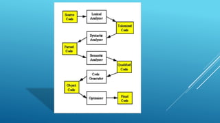 A compiler translates source code from a high-level programming language to lower-level machine code, enabling the creation of executable programs. It consists of several parts, including a lexical analyzer, syntax analyzer, and code optimizer, each responsible for different transformations and error-checking of the source program. Techniques from compiler design are also applicable to various problems in computer science, such as natural language processing and database querying.