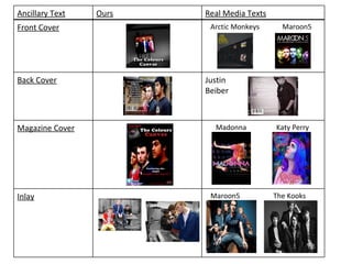 Ancillary Text Ours Real Media Texts Front Cover Arctic Monkeys Maroon5 Back Cover Justin Beiber Magazine Cover Madonna Katy Perry Inlay Maroon5 The Kooks