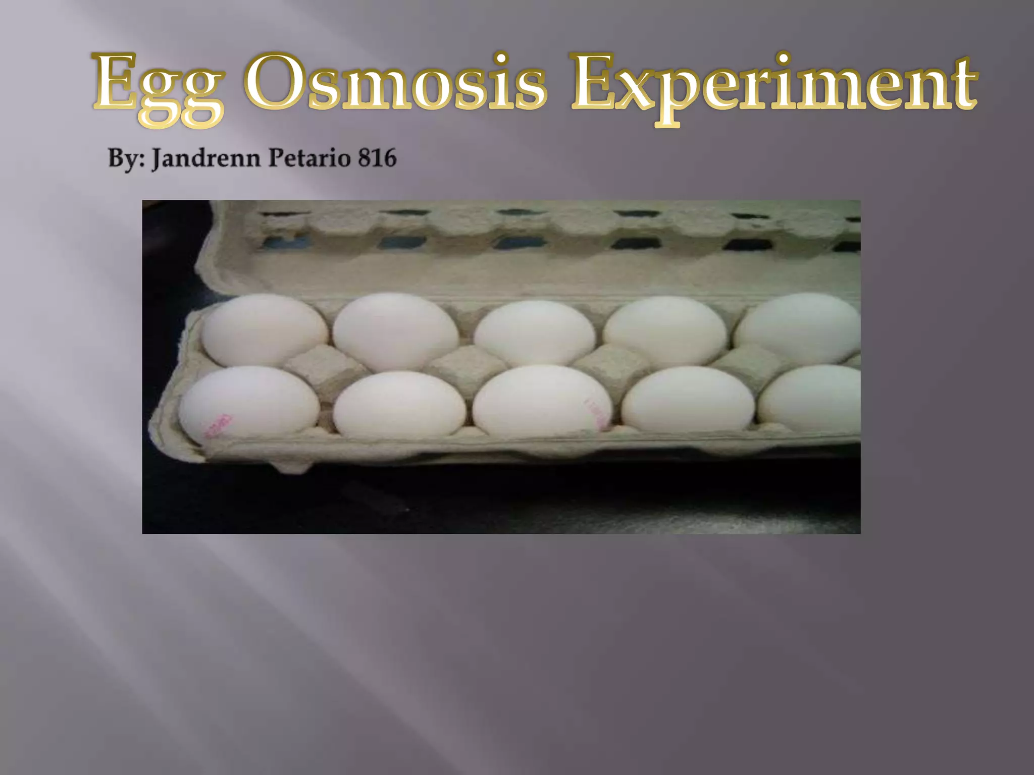 This document describes an experiment to observe osmosis in eggs. Students removed the shell from eggs and measured their initial weight and size. One egg was placed in corn syrup and one in water for 24 hours. The egg in corn syrup shrank and became lighter due to water leaving the egg. The egg in water absorbed water, becoming larger and heavier.