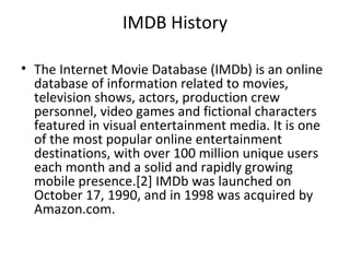 The Internet Movie Database (IMDb) started as a hobby by English film enthusiast Col Needham in 1987 to share information about movies and actors. On October 17, 1990, Col Needham created and posted basic software to allow users to search a movie and TV database on USENET, launching IMDb. The original database was built from credits lists collaboratively compiled by early users. IMDb has grown to be one of the most popular online entertainment destinations with over 100 million users, and was acquired by Amazon in 1998.