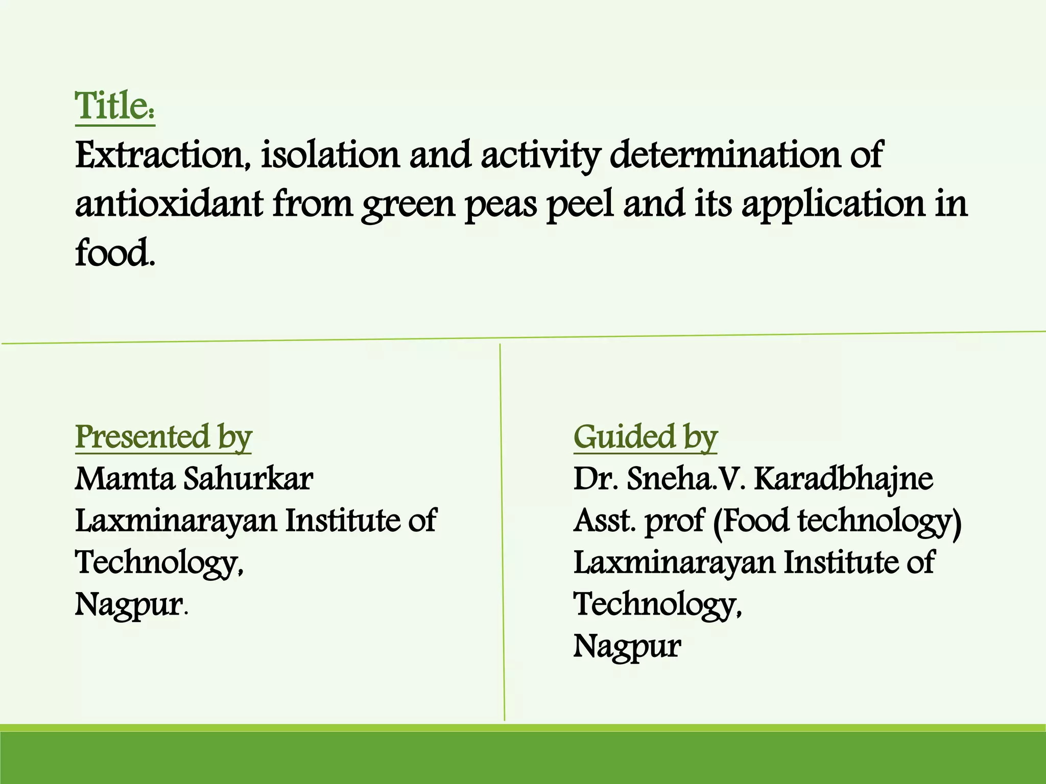 The document summarizes research conducted on extracting antioxidants from green pea peels. Proximate analysis was conducted on pea peels powder, finding high dry matter and organic matter content. Total phenolic content, total flavonoids, DPPH radical scavenging activity, and metal chelating activity were measured to determine the antioxidant activity of extracts from the pea peels powder. Literature was reviewed on using pea peels, a byproduct waste, as a source of antioxidants, nutrients for animal feed, and to prevent environmental issues from waste accumulation. The aim of the presented research was to extract, isolate, and determine the antioxidant activity of compounds from green pea peels and apply them in food to