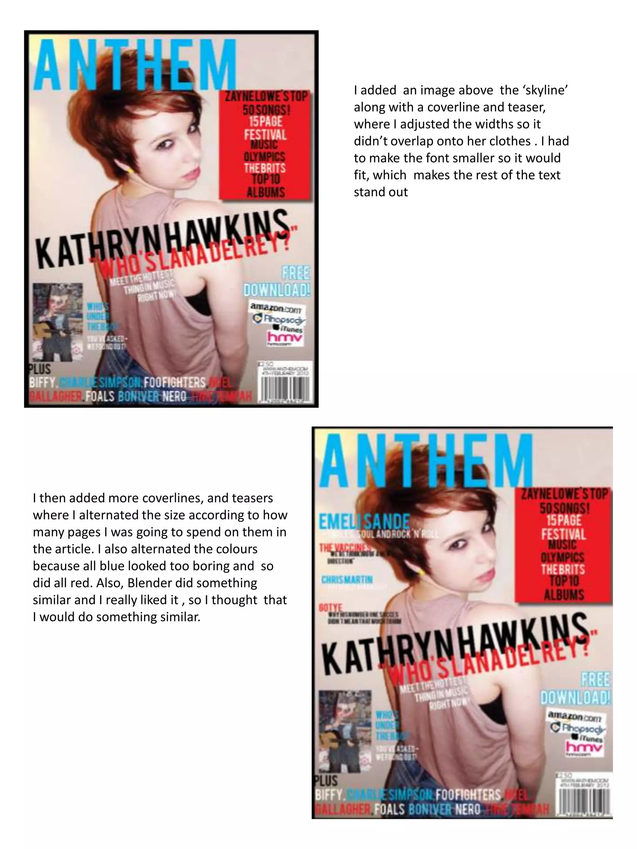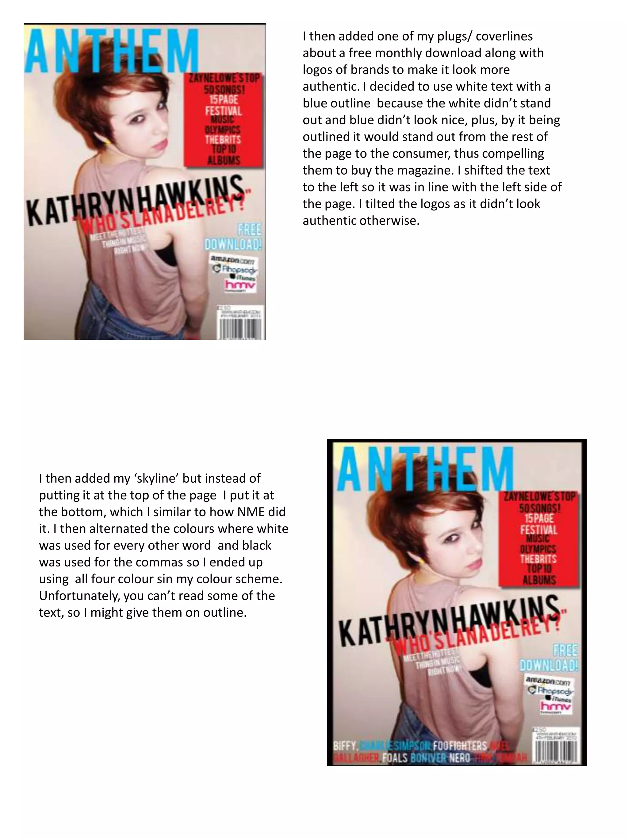 The document describes the process of designing a magazine cover. Key details include adding logos and coverlines to make the cover look authentic, adjusting text placement and colors to make elements stand out, and getting feedback from an audience to improve readability by outlining text and increasing font sizes. The final cover incorporated this feedback.