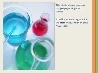 This photo album document provides instructions for creating and customizing photo pages in a digital album. It explains that users can add their own pages by clicking the Home tab and New Slide button, then choosing a layout and clicking placeholders to add pictures and captions. The document also describes how users can format individual pictures by clicking on them and using the Format Picture tab to make adjustments or crop images, and that picture styles can be applied with a single click for framed looks.