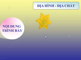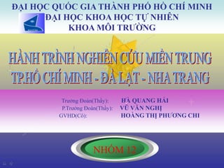 Tài liệu trình bày về địa hình, địa chất, khí hậu và thủy văn của vùng đất miền Trung Việt Nam, đặc biệt tập trung vào các khu vực như Lâm Đồng và Khánh Hòa. Nó cũng mô tả các hệ sinh thái trong rừng quốc gia như Nam Cát Tiên và các mỏ khoáng sản như bauxit Bảo Lộc, cùng với quy trình xử lý nước thải tại Đà Lạt. Ngoài ra, tài liệu nêu rõ tình hình đa dạng sinh học với các loài thực vật và động vật quý hiếm.