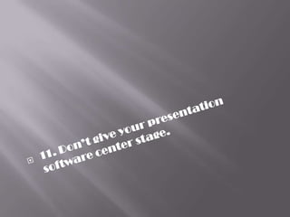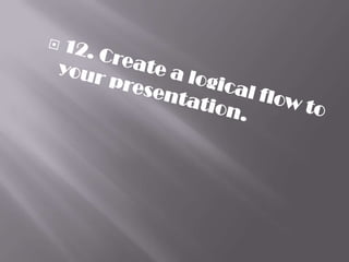 The document provides 10 tips for creating effective presentations: 1) Write a script, 2) Focus on one thing at a time, 3) Avoid paragraphs, 4) Pay attention to design while limiting flashy visuals, 5) Use images sparingly as opinions vary on their usefulness, 6) Engage the audience beyond the screen, 7) Include a hook, 8) Ask questions to engage the audience, 9) Modulate your voice, and 10) Break rules if necessary but otherwise follow them to avoid boring presentations.