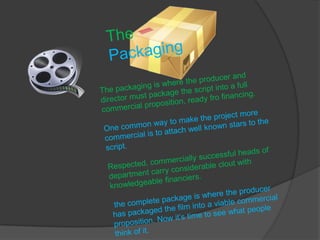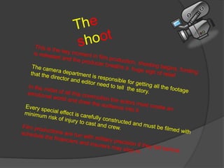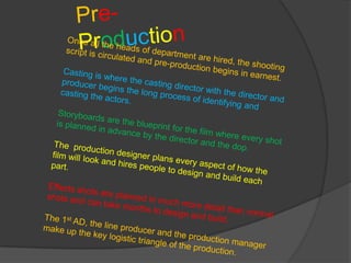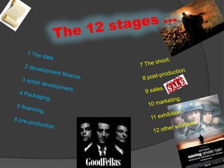 The document discusses the various stages of film production from development through distribution. It notes that the idea is the most important stage as it forms the basis for the film. During development, directors and producers work to secure financing, including by offering future sales rights. Post-production involves editing footage into a narrative, adding sound effects, and finalizing the cut. Films are then sold to distributors through sales agents and test screenings before being marketed and distributed to cinemas and other channels for revenue generation.