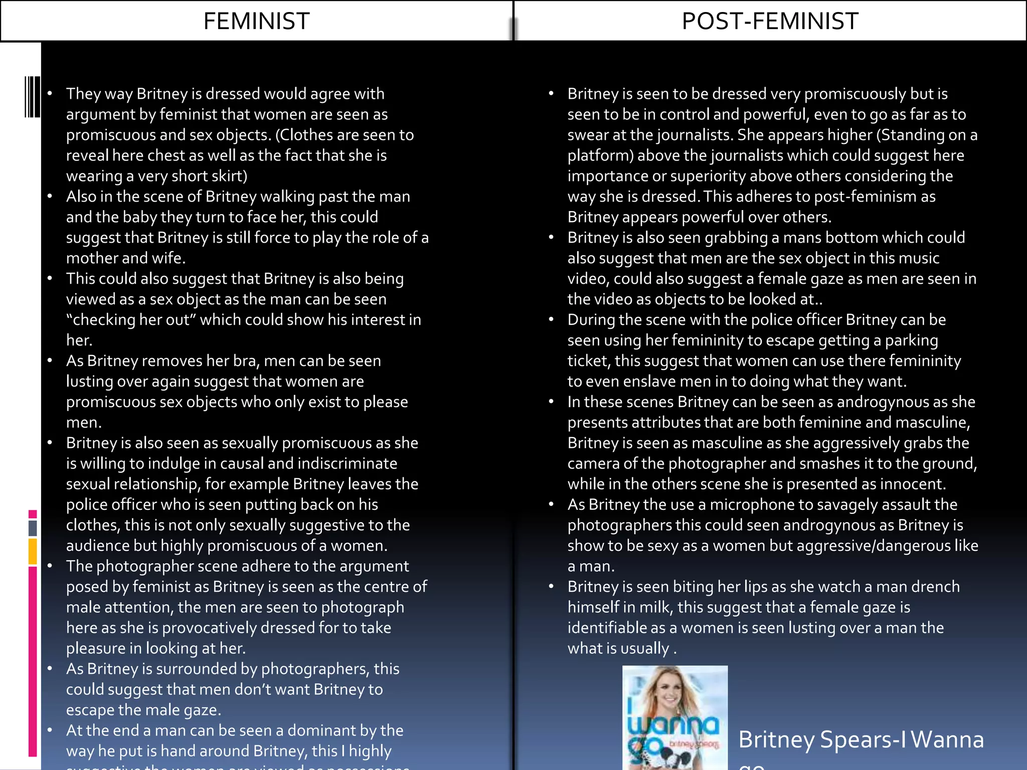 Britney Spears' music video "I Wanna Go" can be analyzed from both feminist and post-feminist perspectives. From a feminist view, Britney is portrayed as a sexual object for the male gaze through her revealing outfit and men lusting after her. However, from a post-feminist lens, Britney is in control and powerful over men as she dominates them physically and uses her sexuality to get what she wants. The video also shows androgynous elements and a role reversal with men as objects through scenes like Britney groping a man.