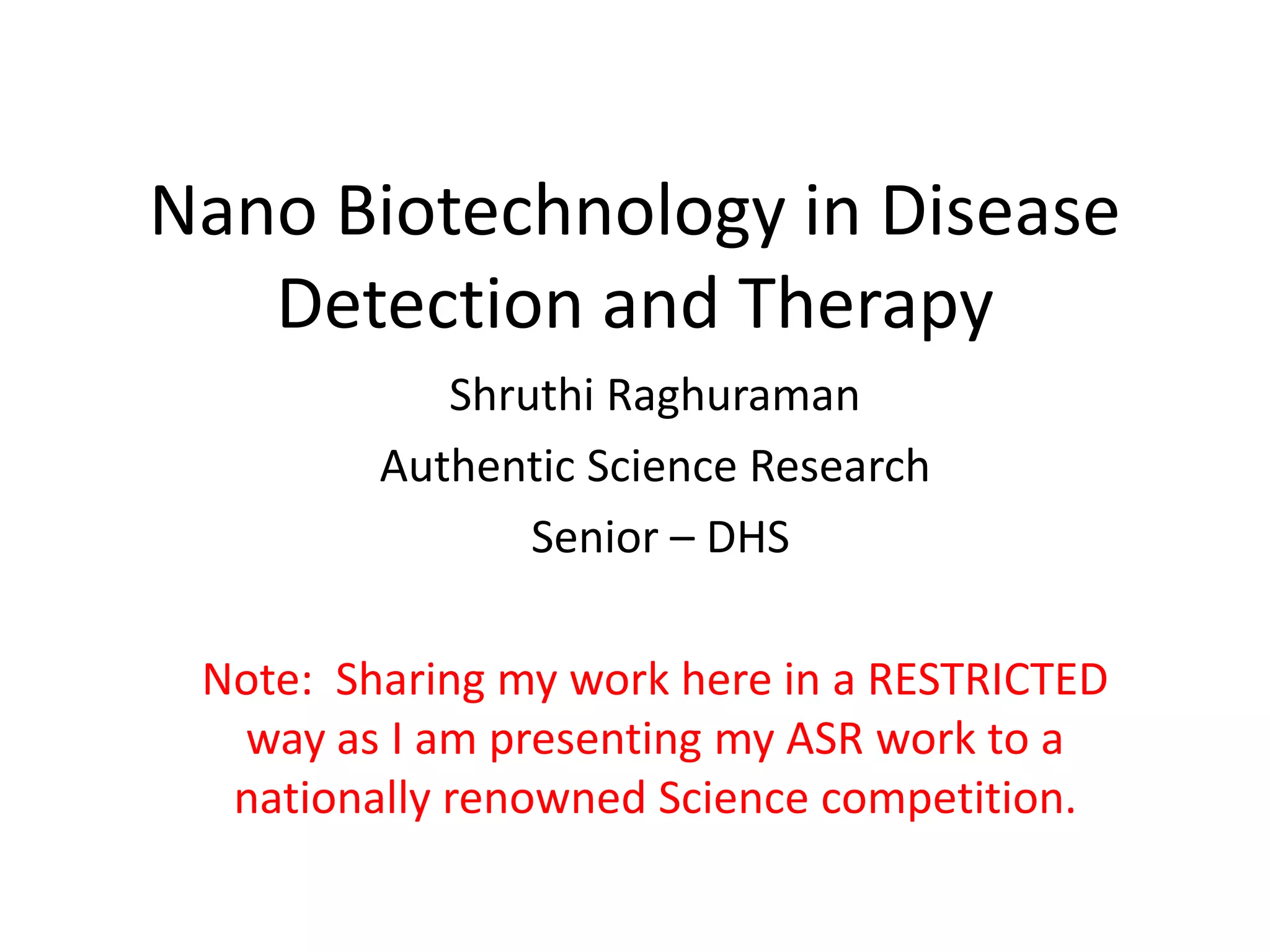 The document describes Shruthi Raghuraman's work using nano biotechnology for cancer detection and treatment, including creating hydrogel microparticles loaded with nanoparticles and a drug to target and slowly release medicine to tumor cells. The goals of the work were to locate cancer cells, carry nanoparticles to tumors, and slowly release medicine, and key parameters that were tested included alginate concentration, calcium chloride concentration, flow rate, agitation, and voltage. Shruthi acknowledges several people who assisted with her authentic science research project.