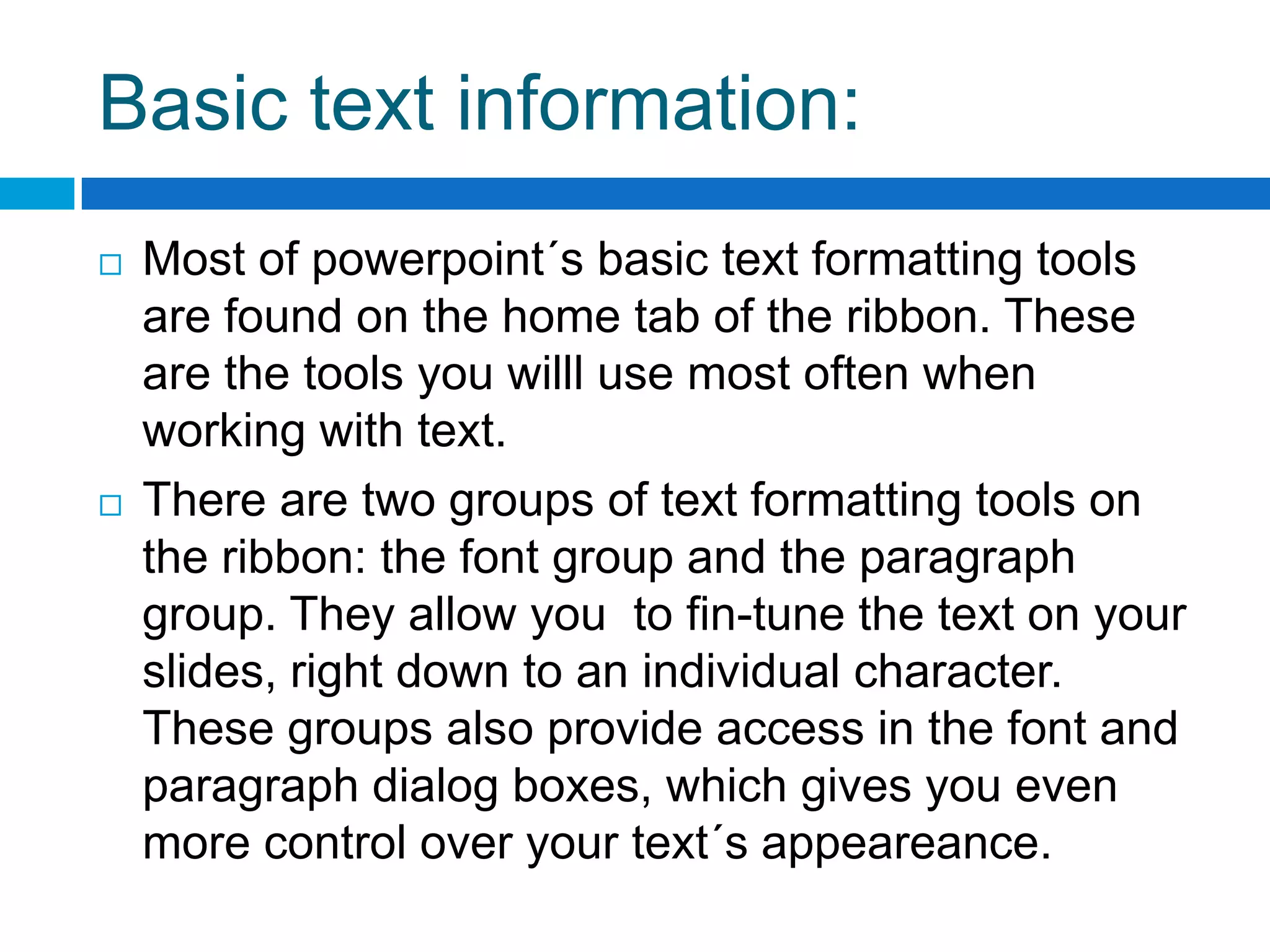 PowerPoint provides many tools for formatting text on slides. The font and paragraph groups allow control over text appearance at the character level. Fonts, sizes, styles, colors and other text properties can be set. Placeholders and text boxes allow flexible text positioning and formatting. Borders, fills and effects offer additional formatting options. Spelling and thesaurus tools help improve written content.