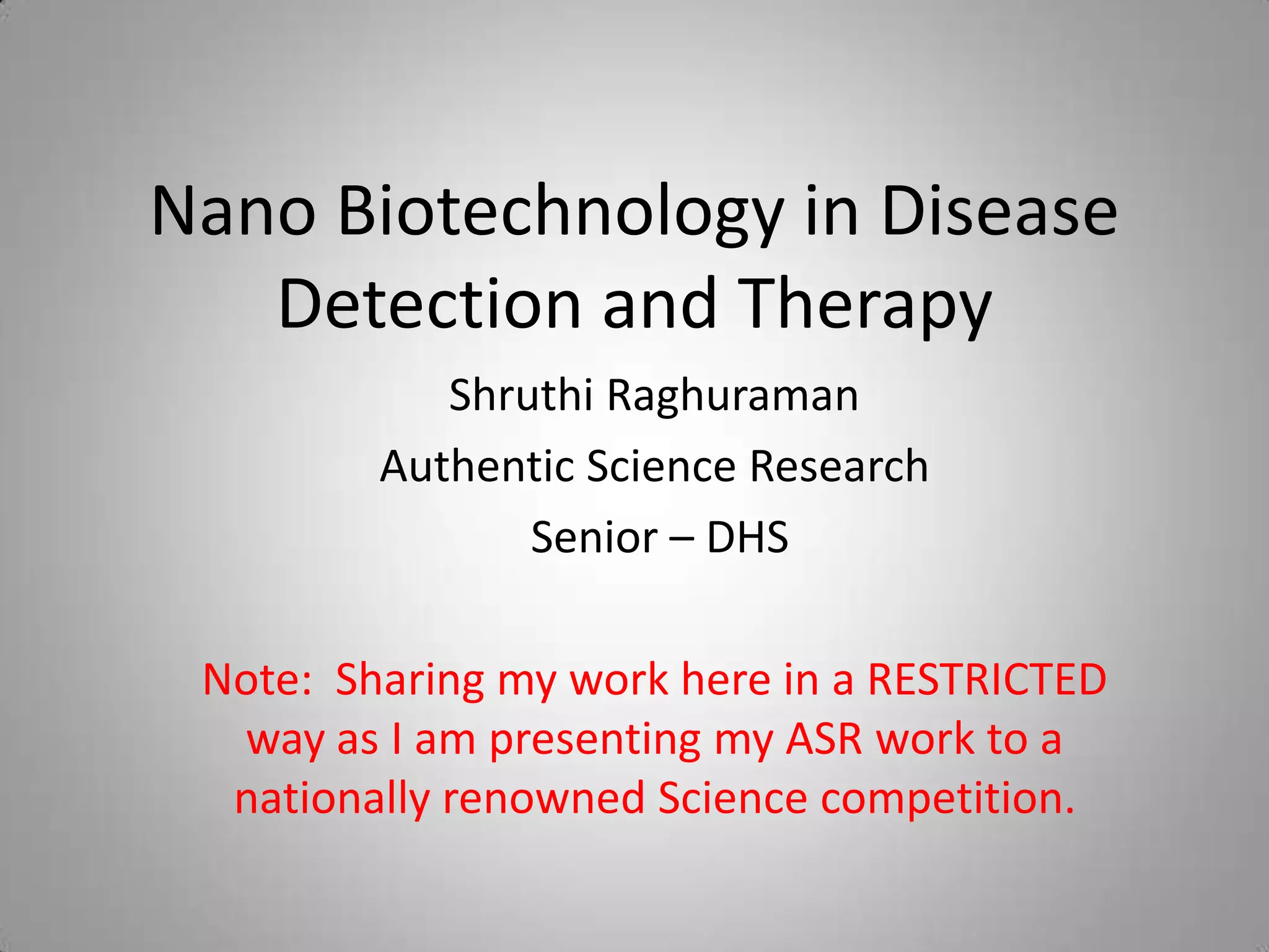 The document discusses Shruthi Raghuraman's work using nano biotechnology for disease detection and therapy, including creating hydrogel microparticles loaded with nanoparticles to target and slowly release medicine to cancer cells, noting various parameters and procedures investigated as well as things learned from the research project. Shruthi acknowledges several people who assisted with her authentic science research work, which she is presenting to a national science competition.