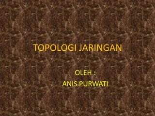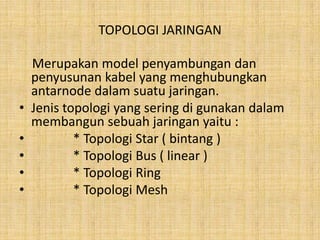 Dokumen tersebut membahas tentang topologi jaringan yang terdiri dari topologi star, bus, ring, dan mesh. Topologi star menggunakan konfigurasi berbentuk bintang dengan titik tengah, topologi bus menggunakan satu kabel utama, topologi ring membentuk pola lingkaran, dan topologi mesh semua node saling terhubung.