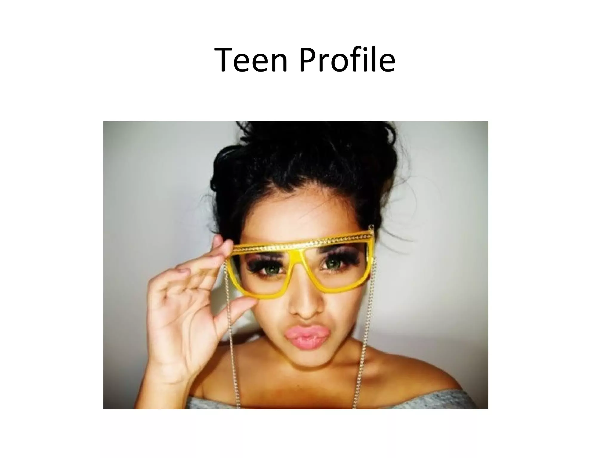 This teen enjoys shopping at Top Shop and H&M for clothes. She communicates with others using messaging apps like Blackberry Messenger, WhatsApp, Viber, Kik and Facebook on her Blackberry phone. She likes watching dance and horror movies in her spare time and reading teen fashion magazines.