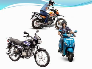 Hero MotoCorp Ltd. is the largest motorcycle manufacturer in India. It was formerly a joint venture between Hero Group of India and Honda of Japan called Hero Honda. In 2010, Honda exited the joint venture and Hero Group acquired Honda's shares. The company has three manufacturing plants in India and a large sales network across the country. It aims to achieve $10 billion in revenue and sell 10 million two-wheelers by 2016-17, including expanding internationally. Hero MotoCorp offers a wide range of motorcycle and scooter models catering to different market segments.