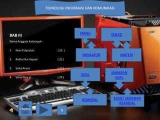 Dokumen ini adalah tentang penggunaan program presentasi, khususnya Microsoft PowerPoint, yang mencakup pengenalan perangkat keras, pengoperasian, dan cara membuat tabel, grafik, dan diagram. Terdapat juga soal-soal remidial dan kunci jawaban terkait pemahaman materi presentasi. Tugas ini merupakan tugas kelompok dengan pembagian materi di antara anggota.