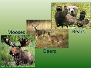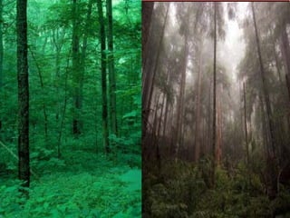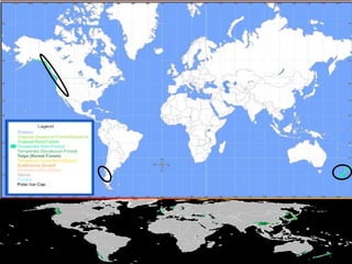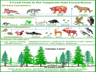 This document summarizes the key features of temperate rainforests, including their limited global distribution in parts of North America, Chile, and New Zealand. It notes that temperate rainforests receive over 200 cm of annual rainfall influenced by nearby oceans, support tall coniferous trees like Douglas fir alongside mosses and lichens, and are home to insects, squirrels, and birds. The document cites its sources as websites providing information on temperate rainforests and temperate forests.
