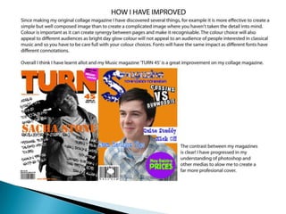 The document summarizes the learning and progression of a student in creating a music magazine from a preliminary collage magazine to a full product. It shows how the student applied lessons from researching magazine conventions and improving Photoshop skills to create a more polished final magazine that effectively targets their intended audience through style and content choices. The student demonstrated growth in using industry tools and understanding the expectations of the media format.