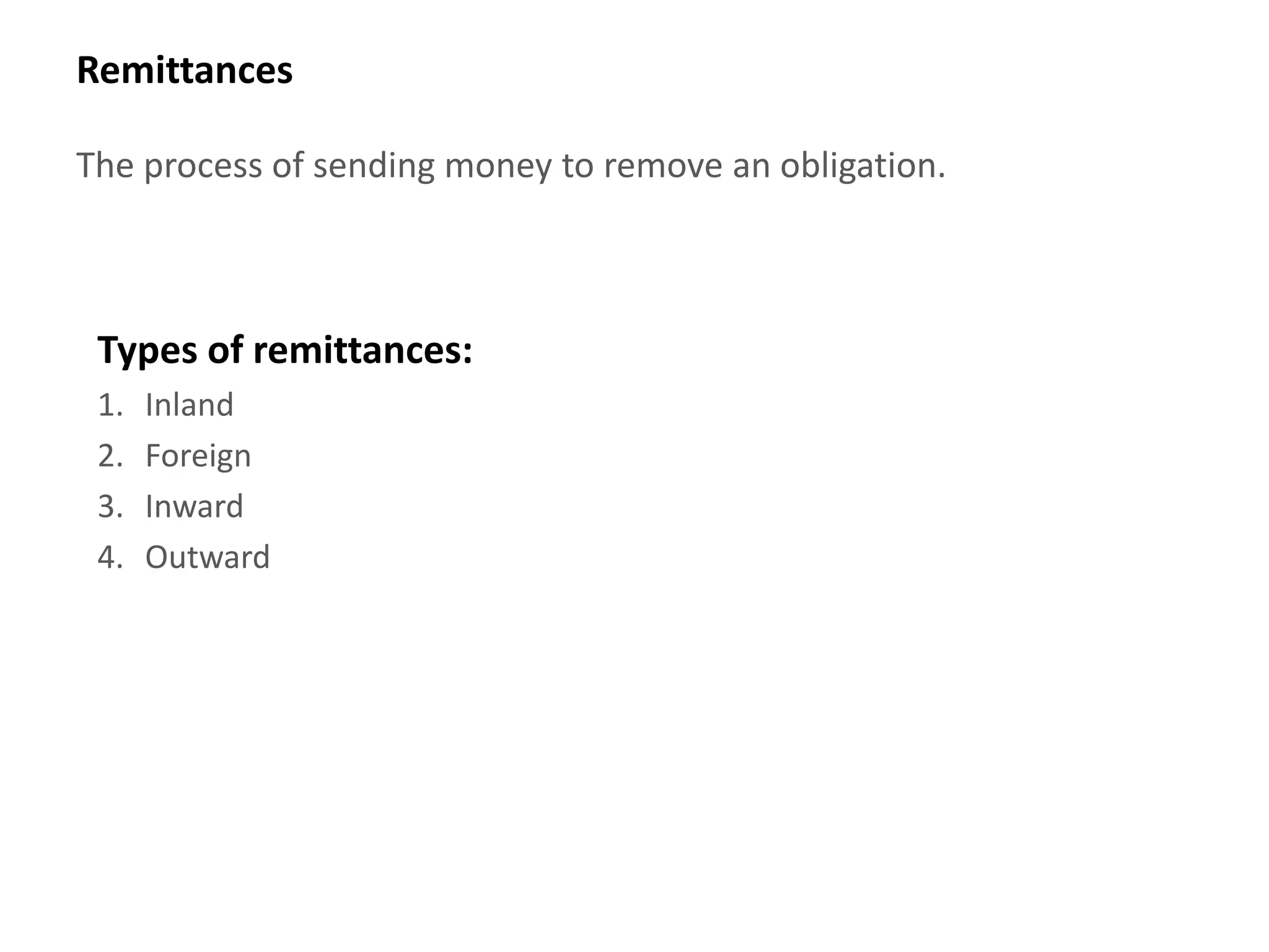 Remittances refer to sending money to remove an obligation or make a payment. There are different types including inland, foreign, inward, and outward remittances. Common modes of remittances are drafts, mail transfers, telegraphic transfers, SWIFT transfers, and electronic fund transfers. Banks must follow proper procedures to facilitate domestic and international remittances securely and in accordance with regulations.