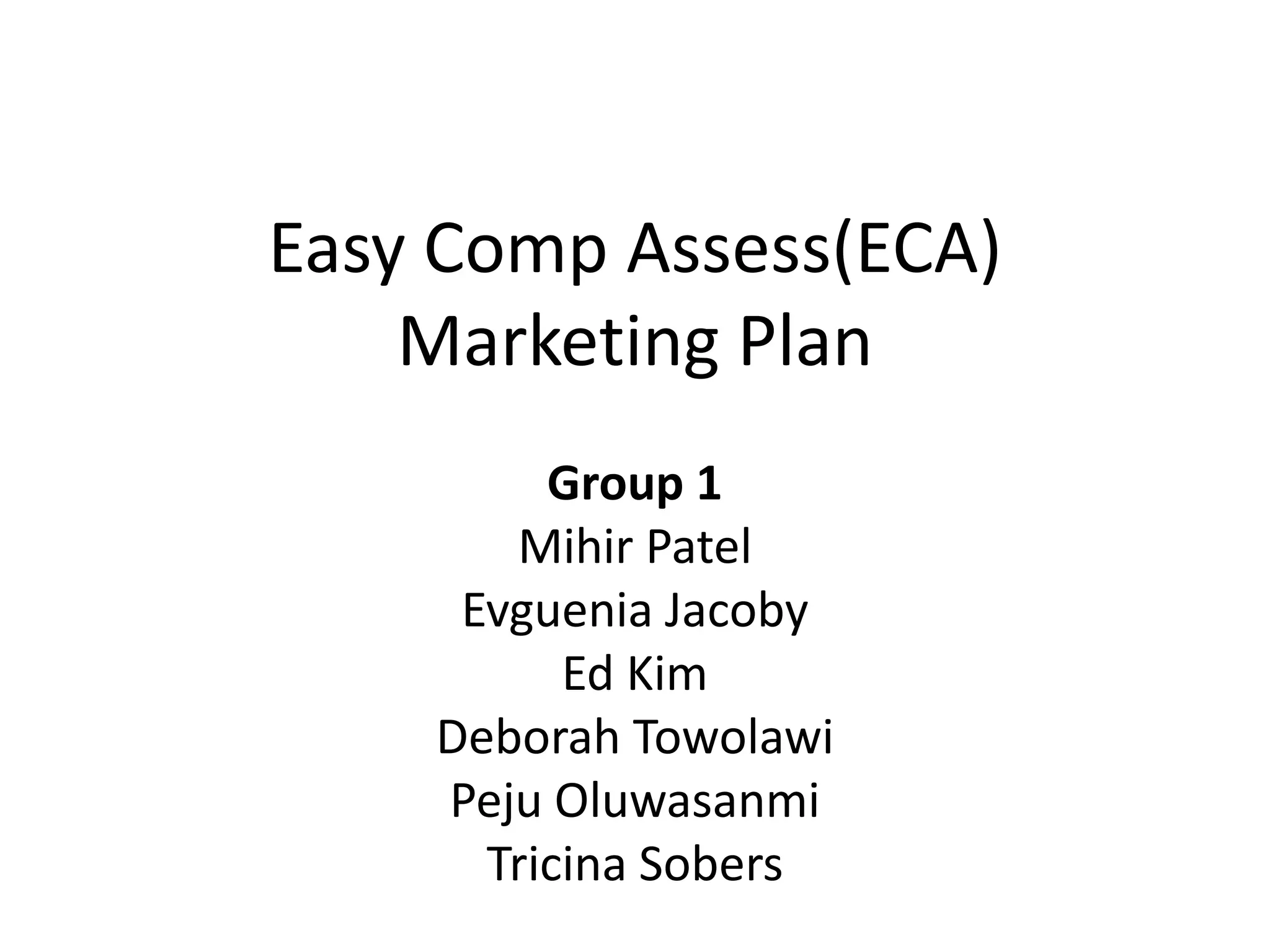 ECA is a proposed laptop rental business targeting Rutgers Newark students. It will rent Dell laptops on flexible terms including semester, month, week, and day rates. Based on a survey, 55% of students prefer semester rentals. Dell was the preferred brand. The business will operate out of the campus center and use low-cost promotions like flyers and campus newspaper ads. It projects breaking even with 100 laptops rented at projected utilization and rental rates.
