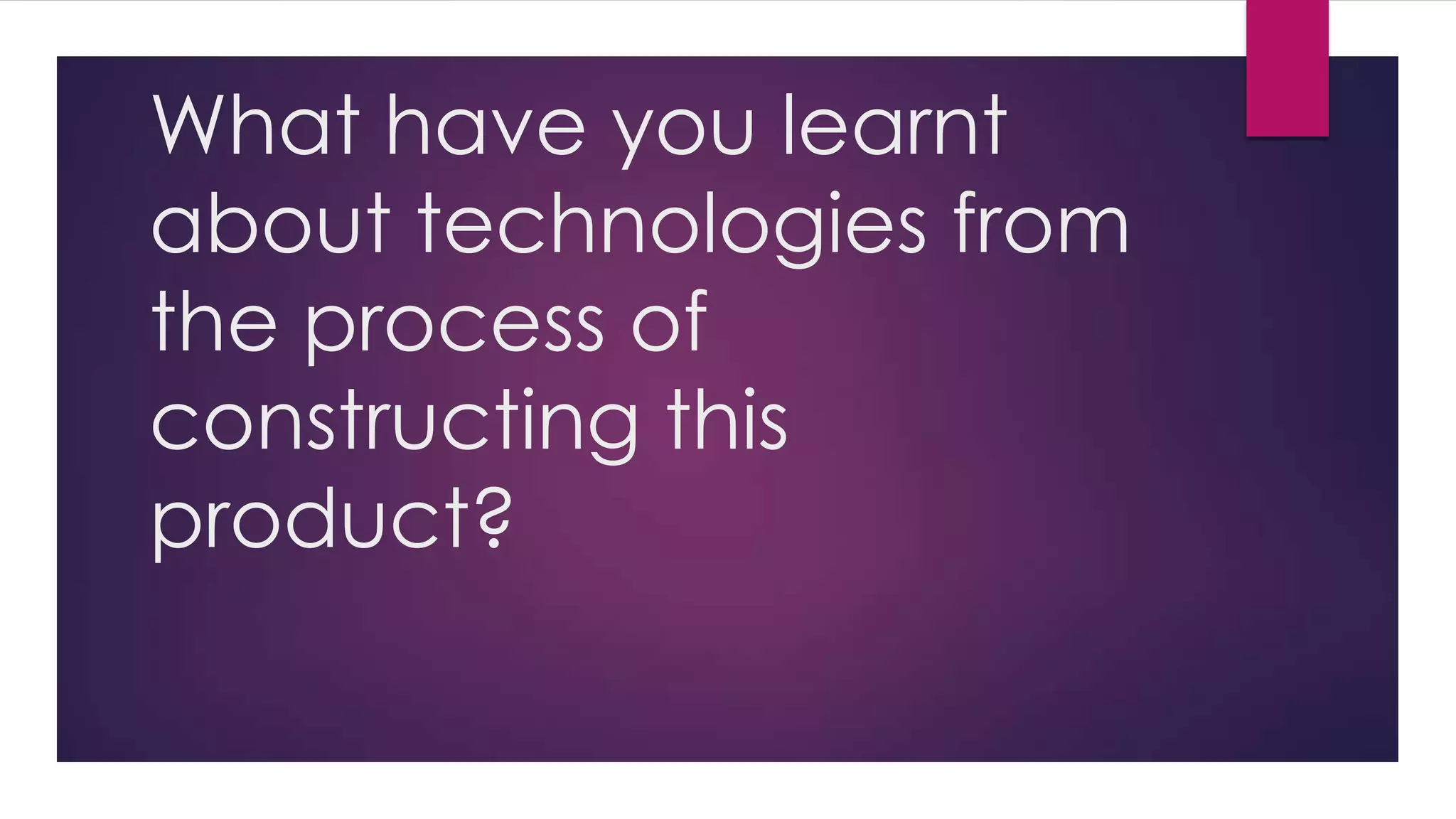 The student learned about various technologies through creating a magazine product. They used a PC for layout, organization, and meeting deadlines. An internet connection allowed research and an effective blog. A printer/scanner was used for drafts, questionnaires, and focus groups. Pictures were taken with a camera and roles like photographer, journalist, designer were assumed. Adobe Photoshop and InDesign were effective design tools while Blogger organized work online. Other sites like SlideShare and Prezi supplemented the blog.