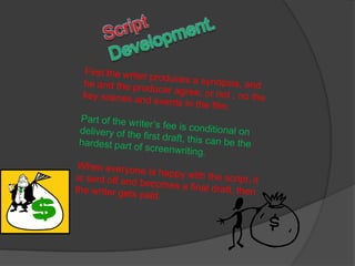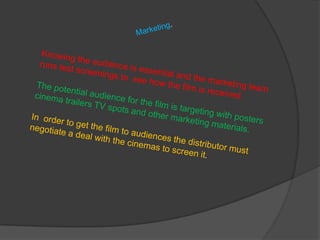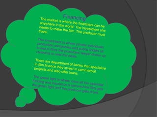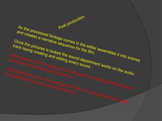 The document discusses the various stages of film production and distribution. It explains that the idea stage is the most important as it forms the basis for the film. During the development stage, directors and producers seek financing from private investors or future sales. Films are then exhibited through premieres, cinema screenings, DVD/Blu-ray sales, television broadcasts, and other channels to generate revenue over time. Profits are distributed according to recoupment schedules once distribution costs are repaid.