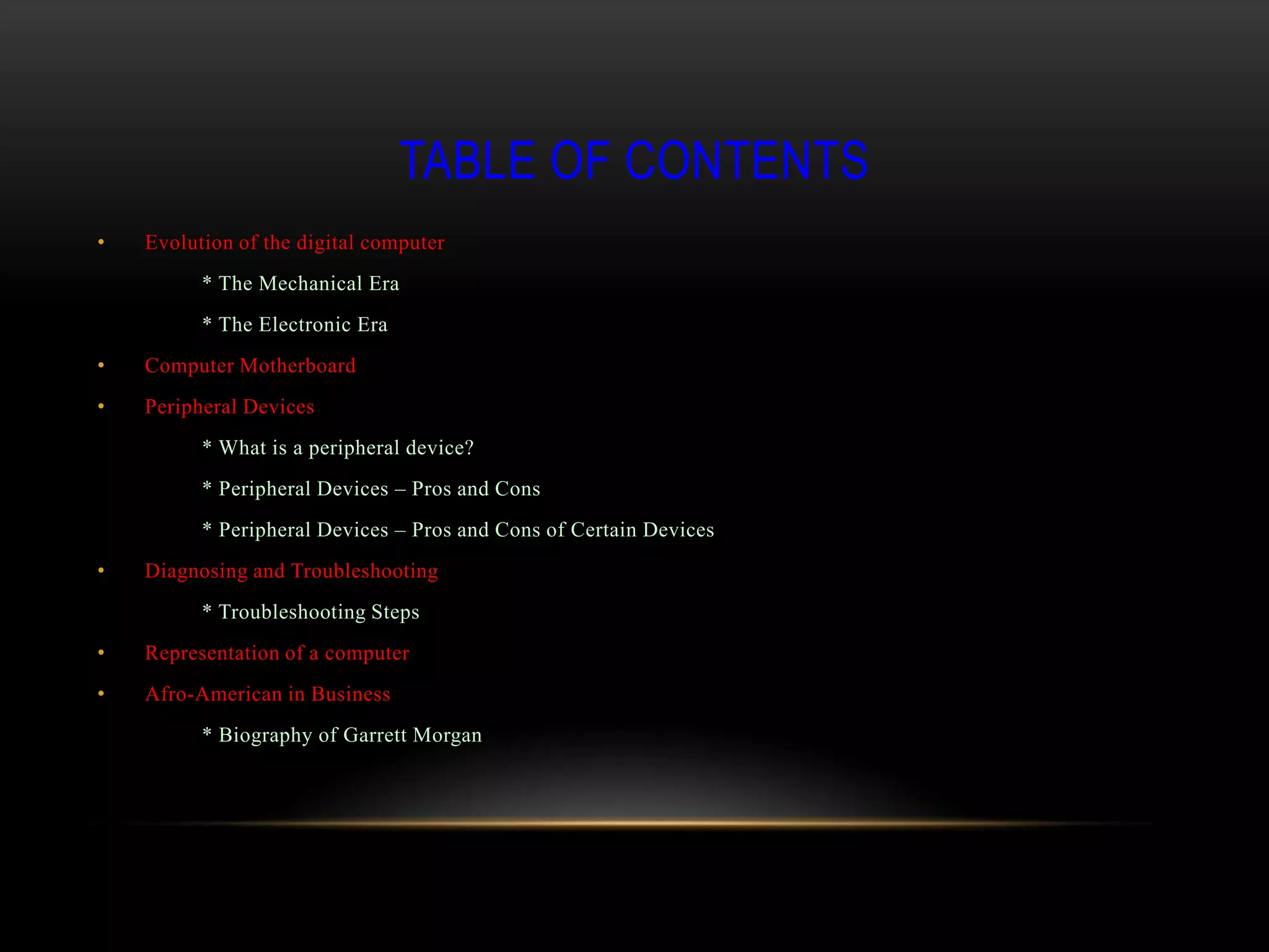The document discusses the evolution of digital computers from the mechanical era to the electronic era. It describes Charles Babbage's early mechanical computers and the development of electronic computers using vacuum tubes. The document also discusses computer motherboards, peripheral devices, and troubleshooting techniques. Peripheral devices have pros like being portable but also cons like taking up ports. Troubleshooting involves systematically identifying symptoms, potential causes, and solutions to restore functionality.