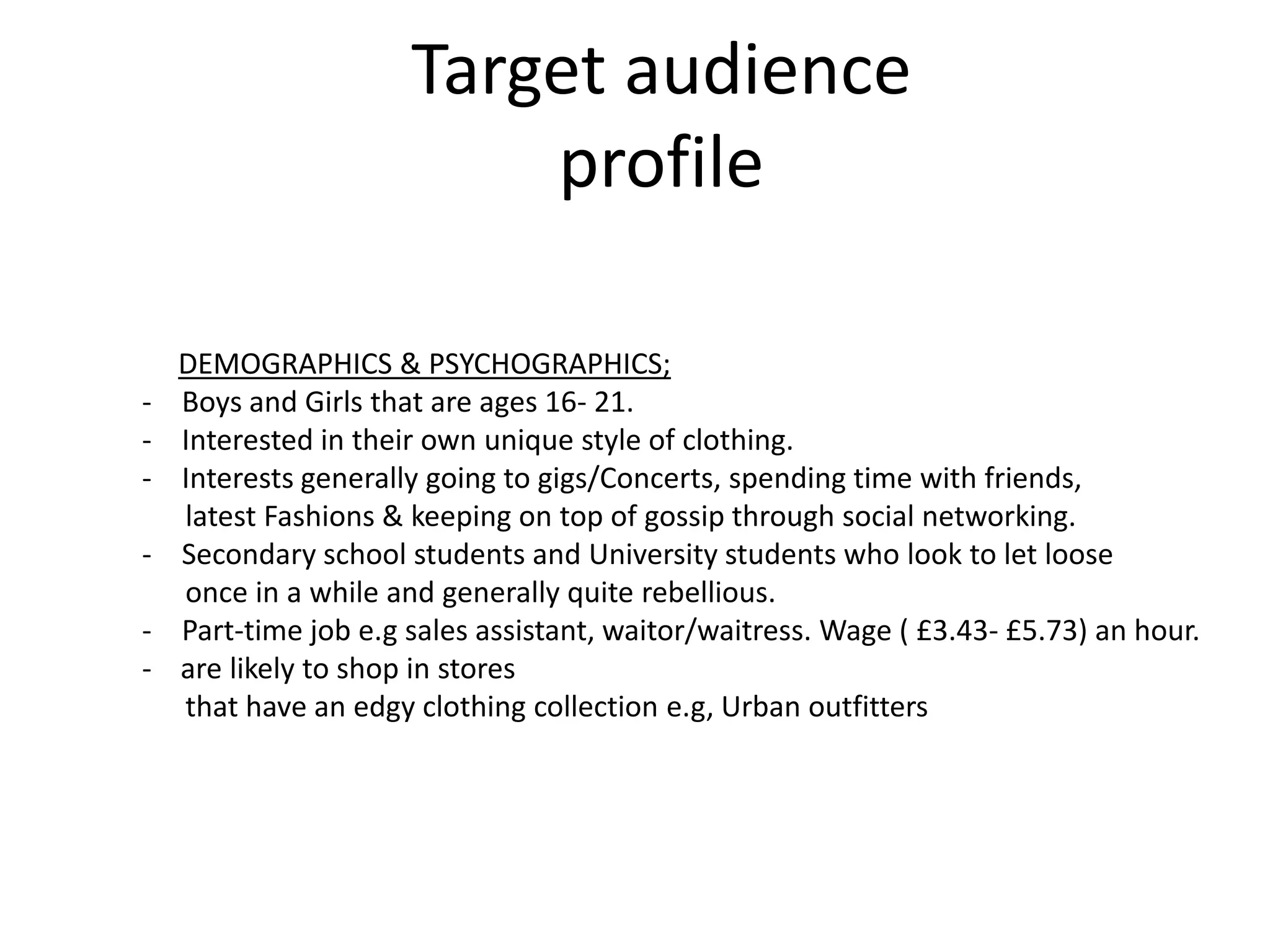 The target audience for the magazine are male and female students aged 16-21 who enjoy music festivals, spending time with friends, and keeping up with the latest fashion trends. They have interests in unique styles of clothing and accessories. The magazine will feature up-and-coming artists as well as established artists that perform at popular music festivals like V Festival and Wireless. It will also include advertisements from clothing stores like Topshop, Topman, Urban Outfitters, and American Apparel that are popular among the target audience.