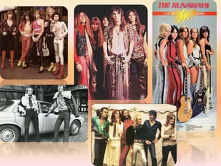 Glam rock developed in the UK in the early 1970s after the hippie era, featuring glitter outfits, pop culture references, and hard guitar riffs. Glam rock artists like Kiss, Queen, and David Bowie embraced sexual ambiguity and blurred gender lines, with men wearing colorful leggings and makeup and women dressing similarly. Glam rock was characterized by male performers who wore makeup and feminine clothing while performing rock music with elaborate stage shows. Although glam rock implied homosexuality, most artists were not gay but used shock factors like makeup and jumpsuits to gain attention.