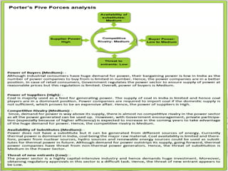 This document provides an overview of the Indian thermal power generation sector. It discusses the current capacity and distribution of coal, gas, and diesel-powered plants across India. It also examines the economics, logistics, financing, and reforms of the sector. Looking ahead, the document predicts that thermal generation will grow by 5.6% annually through 2015 due to increasing coal and gas-fired capacity, before accelerating later in the decade. Key challenges include high AT&C losses, subsidized power rates, and environmental impacts.