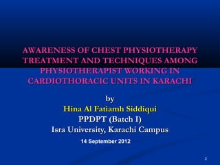 The document discusses a study that surveyed physiotherapists in Karachi, Pakistan about their chest physiotherapy practices for patients undergoing open heart surgery. Key findings included that physiotherapists commonly provide preoperative education and recommend postoperative breathing exercises. The most frequent techniques used were deep breathing without devices and incentive spirometry. Recommendations for continuing exercises after discharge varied. The study provides insight into chest physiotherapy awareness and techniques used among cardiothoracic physiotherapists in Karachi.