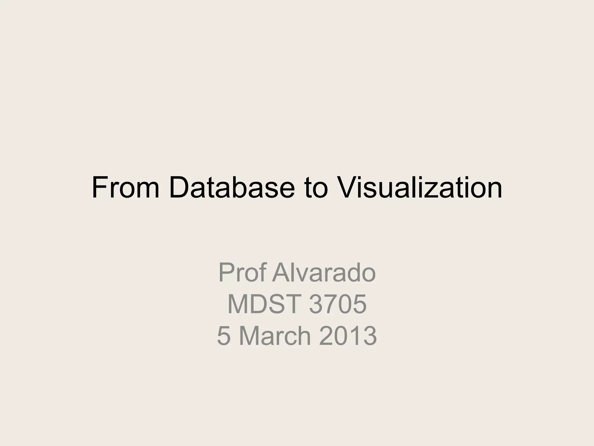This document discusses database visualization and transformation. It provides examples of different types of visualizations including image grids, network graphs, adjacency matrices, arcs and circles. It explains that raw data undergoes a series of transformations to data models, queries and arrays before being arranged visually. Different visualization techniques use space, location and other elements differently to reveal patterns in the data.